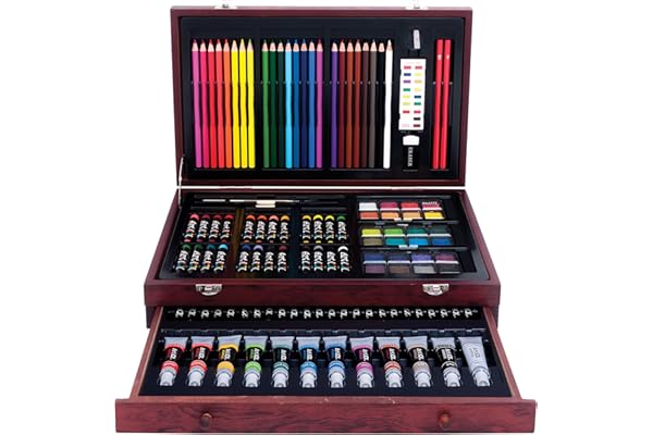Includes Color Pencils, Paints, brushes and palettes, Learning guides, Portable Art Studio