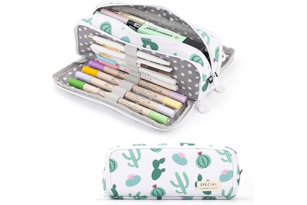 ANGOOBABY Large Pencil Case Big Capacity 3 Compartments Canvas Pencil Pouch for Teen Boys Girls School Students (Green Cactus)