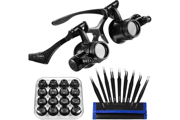 Headband Magnifier with LED Light for Jewelry Clock Electronics Repair Magnifying Glass Loupe with Precision Tweezers and 8 Interchangeable Lens: 2.5X/ 4X/ 6X/ 8X/ 10x/ 15x/ 20x/ 25x
