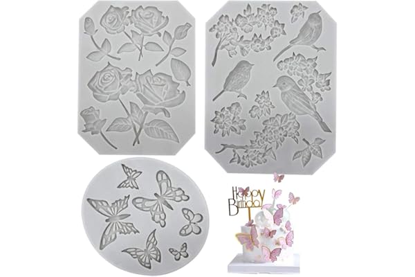 3 Pack Butterfly Rose Flower Stems Birds Blossoms Silicone Fondant Mold