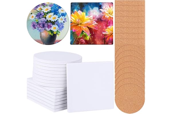 Ruisita 16 Pack White Ceramic Tiles with Cork Backing Pads 4 Inch Round and Square Ceramic Coasters for Arts Crafts