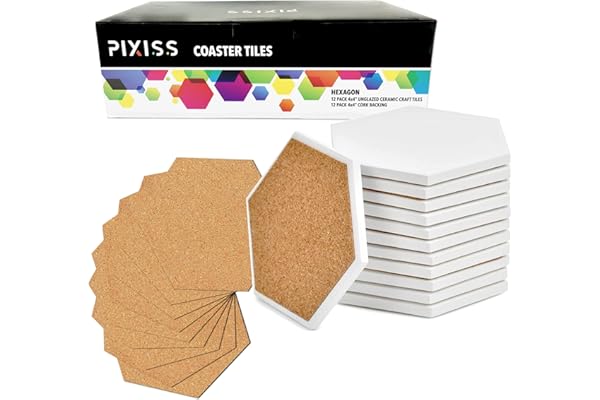 12 Hexagon White Tiles Unglazed 4-Inches with Cork Backing Pads, for Alcohol Ink or Acrylic Pouring, DIY Make Your Own Coasters, Mosaics, Painting Projects