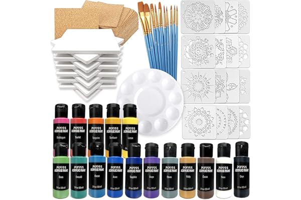 12 Ceramic White Tiles, Cork Backing Pads, 16 Reusable Craft Stencils, Acrylic Paint, Paint Pallet, Brushes, Pallet Tile Coaster Pouring Bundle