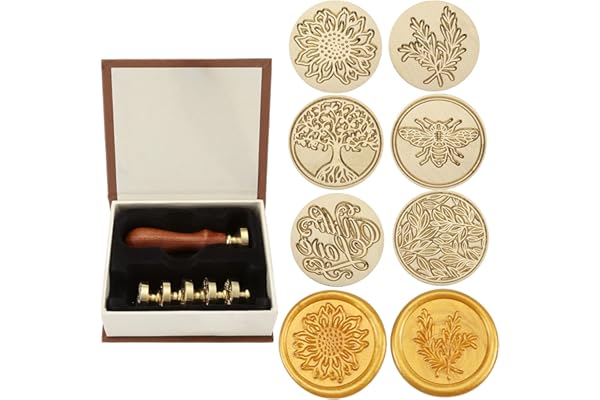 Yoption 6 Pieces Plant Series Sealing Wax Stamp Heads + 1 Wooden Hilt, Vintage Seal Wax Stamp Kit with Gift Box (Sunflower+Tree of Life+Bee+with Love+Rosemary+Leaves)