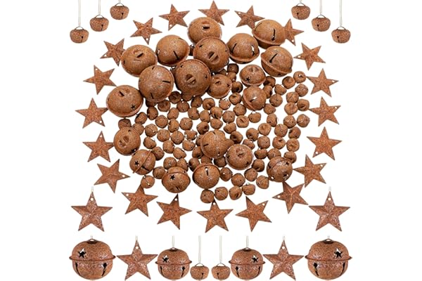 Includes 100 Rustic Small Bell 20 Star Cutout Bell 20 Metal Star Vintage Ornament for Christmas Home Decor DIY Craft (Rusty)