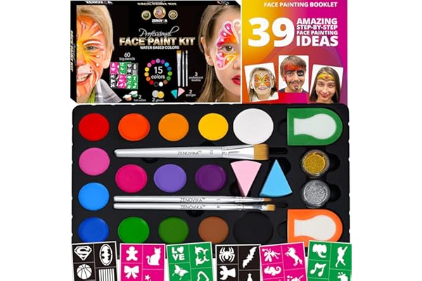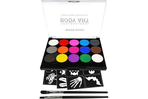 60 Jumbo Stencils, 15 Large Water Based Paints, 2 Glitters - Halloween Makeup Kit, Professional Face Paint Palette, Safe for Sensitive Skin, Face Painting Book