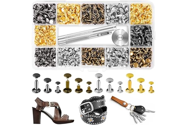 Double Cap Brass Rivets Leather Studs with 3PCS Setting Tools for Leather Repair and Crafts, 4 Colors and 3 Sizes