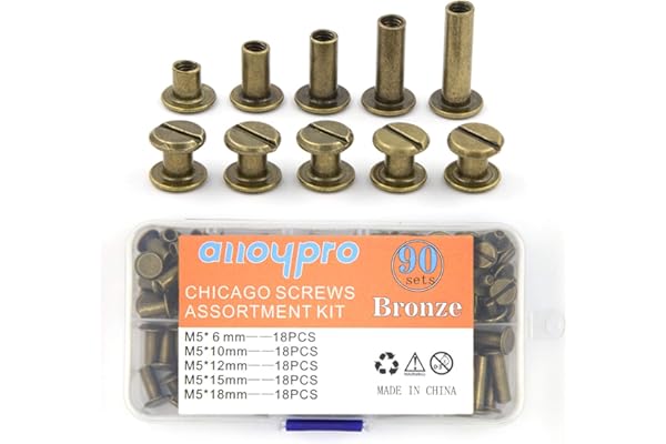 90 Sets Chicago Screws Assorted Kit 5 Sizes Bronze Leather Rivets 5mm Screw Rivets Flat Fillister Book Binding Posts Nail Rivet Chicago Bolts for DIY Leather Craft Bookbinding (6,10,12,15,18mm)