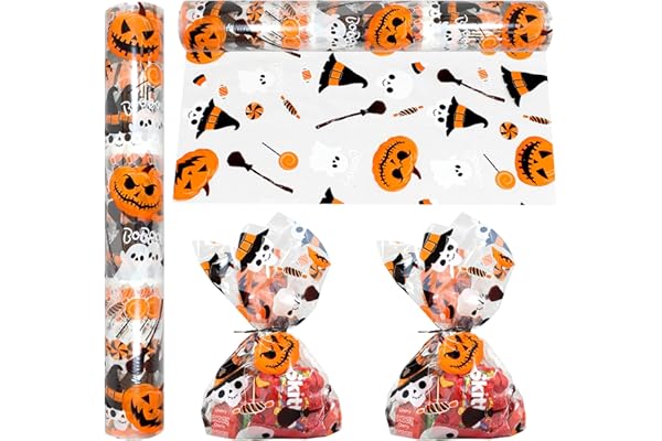 100’ Ft Long X 16” in. Wide | 2.3 Mil Thick, Crystal Clear with Halloween Designs| Gifts, Baskets, Treats Cello Wrapping Paper | Pumpkin, Witches Cello Roll | Anapoliz