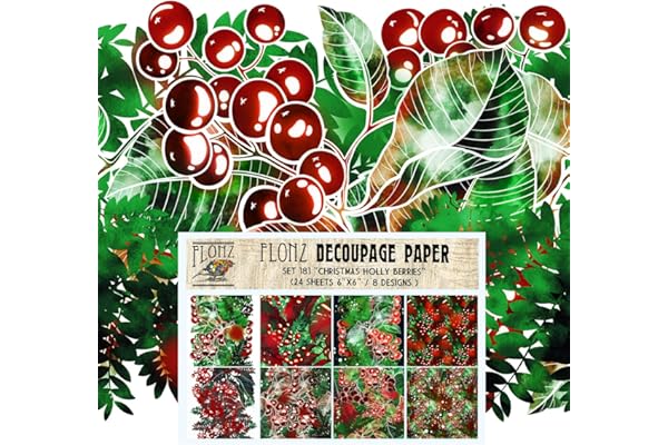 Decoupage Paper Pack (24 Sheets 6"x6") Christmas Holly Berries # Vintage Styled Seamless Pattern Paper for Decoupage