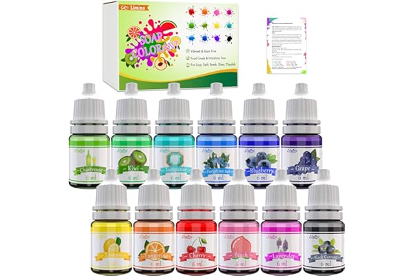 10 Liquid Colors for Soap Coloring,Coal Black, Royal Blue,Chocolate Brown,Lemon Yellow,Fruit Green,Sunset Red,Sunset Yellow,Deep Pink,Super Red and Grape Violet.