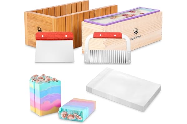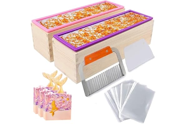 2 Pcs 42 oz Loaf Flexible Rectangular Soap Mold with Wood Box, Wavy Cutter & Straight Cutter & 100 Pcs 6 x 6 inch