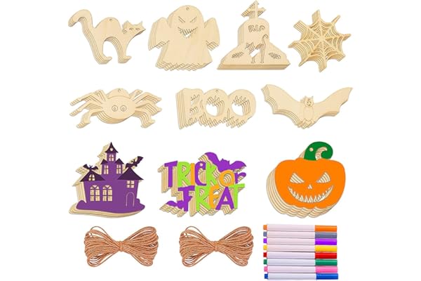 Max Fun 60PCS Halloween Wooden Slices Cutouts Ornaments DIY Crafts Unfinished Pre-drilled Natural Wood for Kids Halloween Hanging Decorations Gifts