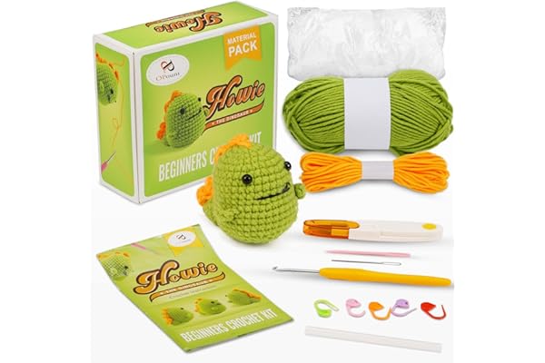 Cute Dinosaur, Complete Crochet Kit for Beginners, Starter Pack for Adults and Kids, Bundle Includes Yarn, Hook, Needles, Scissors, Accessories
