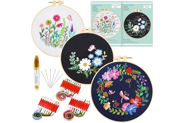 Cross Stitch Kits Include 3 Embroidery Cloth with Floral Pattern, 3 Plastic Embroidery Hoops, Color Threads and Tools