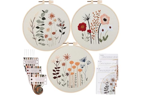 Uphome 3 Pack Embroidery Starter Kit for Beginners Stamped Cross Stitch Kits with Cute Flowers and Plants Patterns with Embroidery Hoops and Color Threads for Adults Kids