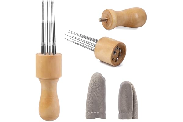 Craft Wool Felt Stitch Punch Tool with Solid Wood Handle Felting Eight Needles Tool with Finger Cots