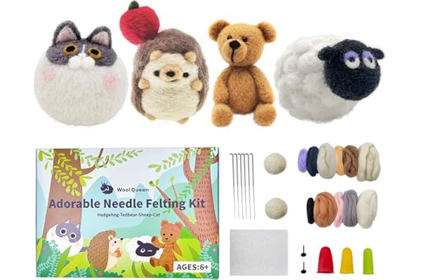 Hedgehog, Tedbear, Sheep, Cat, Pure Queensland 70S Fine Wool, Felting Foam Mat, 6 Needles, Instruction & Videos- Great for Arts & Crafts & Easy for Beginners