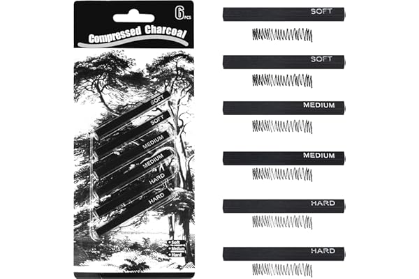 Square Vine Charcoal Sticks for Drawing, Pack of 6 (2 Soft, 2 Medium and 2 Hard)