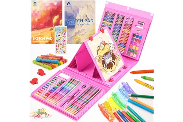 240-Piece Drawing Art kit, Gifts Art Set Case with Double Sided Trifold Easel, Includes Oil Pastels, Crayons, Colored Pencils, Watercolor Cakes, Sketch Pad (Pink)