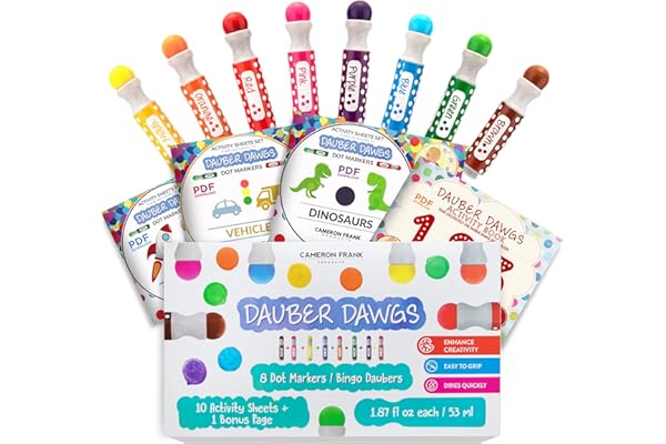 8-pack Washable Dot Markers / Bingo Daubers Dabbers Dauber Dawgs Kids / Toddlers / Preschool / Children Art Supply 3 Pdf Coloring eBooks = 100 Activity Sheets To Do!