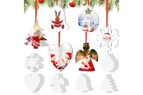 30 Pieces Sublimation Ornament Blank Sublimation Double Sided Blanks Christmas Ornament Blank Personalized Sublimation Blank Pendants DIY Sublimation Pendant Blank with Red Ribbon (Multi Styles)