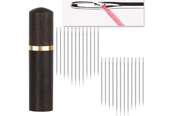 24 Pieces Self Threading Needles for Hand Sewing, Easy Thread Needles for Hand Sewing with Wood Needle Case ( Light Brown )