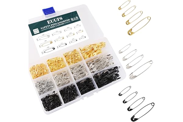 EUUPS 4 Sizes Safety Pins Assorted, Durable & Large Strong Safety Pins Bulk for Art Craft Sewing Jewelry Making Home Office Use with Storage Box, Gold Silver Black