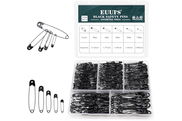 EUUPS 4 Sizes Safety Pins Assorted, Durable & Large Strong Safety Pins Bulk for Art Craft Sewing Jewelry Making Home Office Use with Storage Box, Gold Silver Black