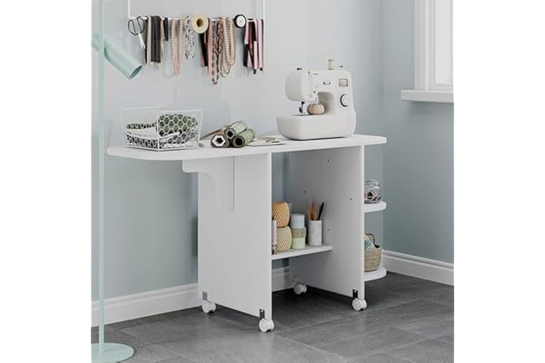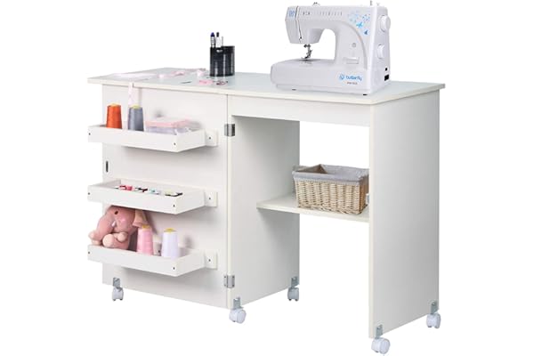 White Sewing Table Foldable Sewing Machine Table with Storage Mobile Hobby Craft Table with Drawers in Black/White