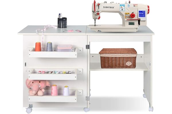 Folding Sewing Table Multifunctional Sewing Machine Cart Table Sewing Craft Cabinet with Storage Shelves Portable Rolling Sewing Desk Computer Desk with Lockable Casters(White)