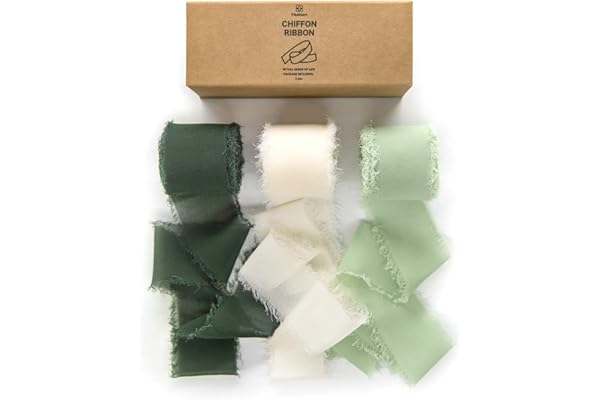 Vitalizart 3 Rolls Handmade Fringe Chiffon Silk Ribbon Gauze 1.5" x 7Yd Cream & Green Ribbons Set for Wedding Invitations
