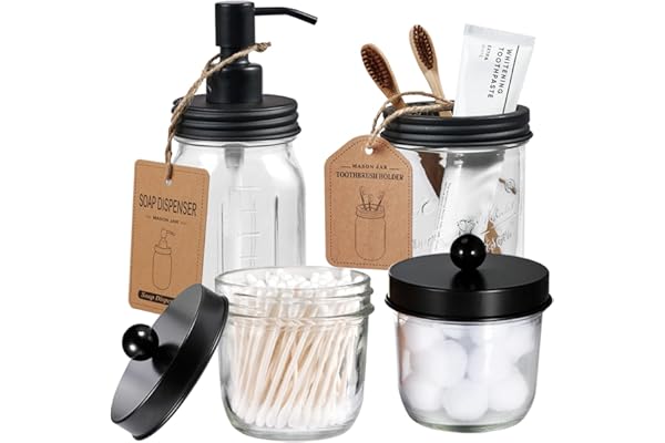 Mason Jar Bathroom Accessories Set 4 Pcs -Lotion Soap Dispenser & 2 Cotton Swab Holders & Toothbrush Holder
