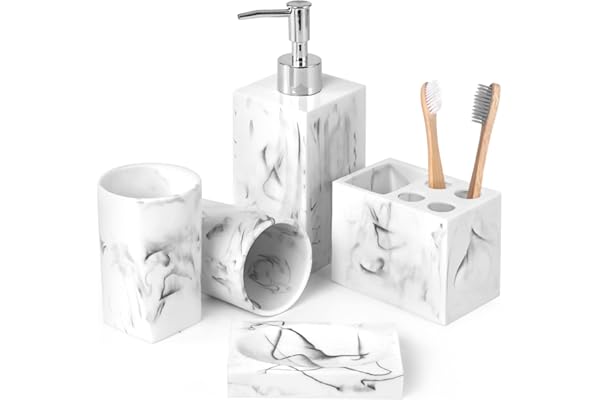5 Pcs Marble Look Bathroom Sets Soap Dispenser & Toothbrush Holder Set, Counter Top Restroom Apartment Decor Stuff, Resin Kits, Gift for Women and Men, Ink White