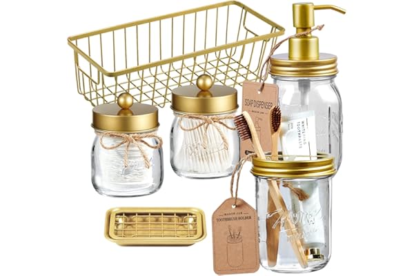 Lotion Soap Dispenser,Toothbrush Holder,2 Apothecary Jars, Soap Dish Tray,Storage Organizer Basket Bin - Rustic Farmhouse Home Decor (Gold)