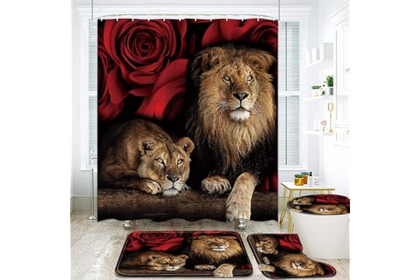 jieprom 4PCS Red Rose and Lion Shower Curtain Set with Non-Slip Rugs