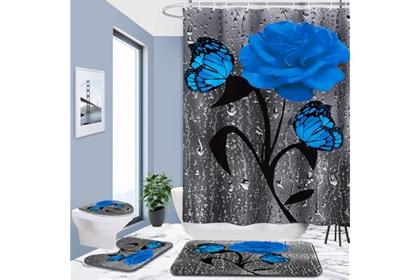 Blue Rose Shower Curtain Valentine's Day Shower Curtain Sets with Rugs(Bath Mat,U Shape and Toilet Lid Cover Mat) and 12 Hooks
