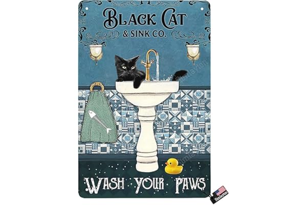 Tin Sign, Funny Black Cat Pattern - Bathroom Use, Vintage Style - Toilet Use, Wash Your Paws, Hang or Stand On Desk - 8"x12"