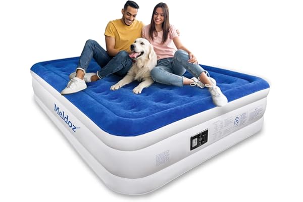 Meldoz Queen Air Mattress with Built-in Pump, Double High Blow Up Mattress for Home, Camping & Guest, 3 Mins Quick Inflate, Inflatable Air Bed with Water Resistant Flocked Top