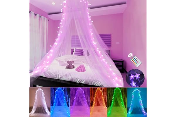 Princess Canopy Bed Curtain with 18 Colors Changing String Lights Remote Timer for Girls Bedroom, Pink Red Blue White Dome Canopy for Twin to King Size Bed