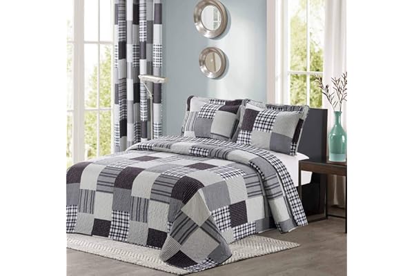 All American Collection Black and Grey Modern Plaid Bedspread and Pillow Sham Set