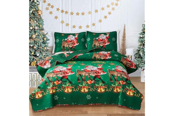 Green Christmas Bedding Quilts Twin Size Xmas Santa Elk Bell Bedspread New Year Gifts Lightweight Coverlet Blanket Holiday Home Decor