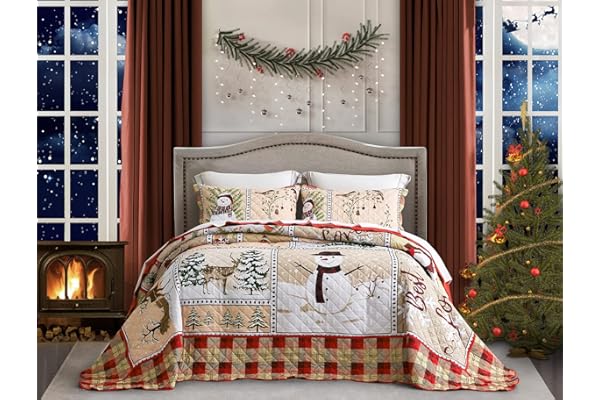 Snowman Pattern Bedding Quilt, Rustic Lodge Plaid Patchwork Coverlet Set, Lightweight & Soft Microfiber, 3 Piece, King/Cal King