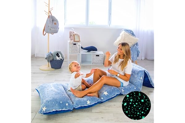 COLUX Glow in The Dark 3 in 1 Kids Pillow Bed Floor Lounger Cover Navy Stars Stuffable Queen Size Fold Out Recliner for Boys