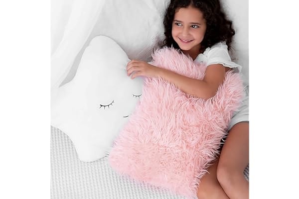 Set of 2 Decorative Pillows for Girls, Toddler Kids Room. Star Pillow Fluffy White Embroidered and Furry Pink Faux Fur Pillow. Soft and Plush Girls Pillows