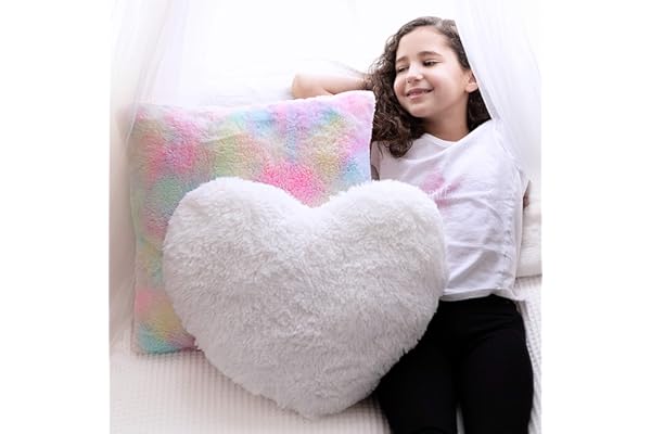 White Fluffy Heart and Soft Rainbow Pillow. Plush Pillows for Kid’s Bedroom Décor Toddlers Princess Room, Fun Pillows for Teepee Tent
