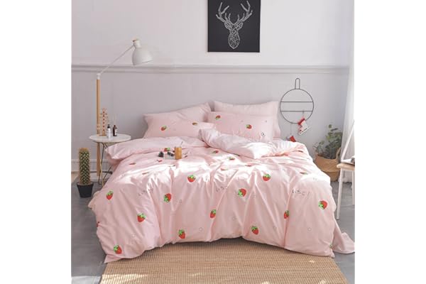 1 Kawaii Strawberry Duvet Cover and 2 Pillowcases, Japanese Style Quilt Cover Queen, No Comforter