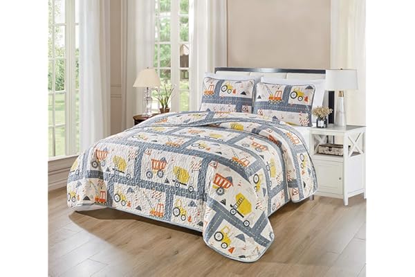 AZORE LINEN Kids’ Soft Microfiber Boys White Orange Yellow Grey Construction Themed Quilt Bedspread Bedding Coverlet Set (Construction Orange Crane, Full / Queen)