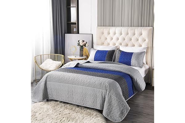 PERFEMET 3 Pieces Blue Striped Alternative Queen Size Quilted Bedding Set