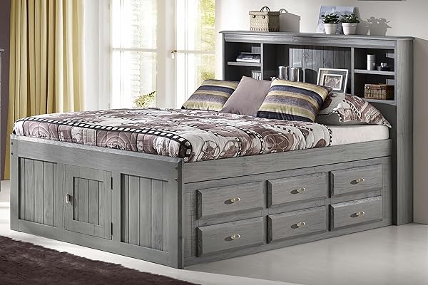 Discovery World Furniture Charcoal Full Size Bookcase Captain Bed with 6 Drawer Storage on ONE Side Opposite Side is Open